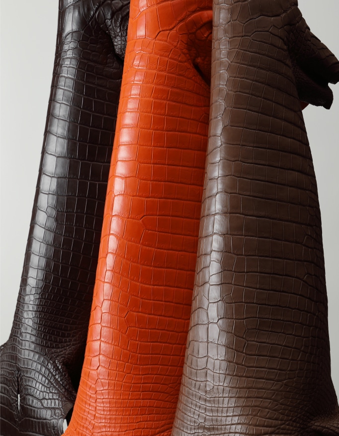 クロコダイルやアリゲーターはお腹の部分に価値があり、ワニ革の腑の美しさを体験することができます。竹腑とよばれる四角いウロコと、丸腑という脇腹部分にあたる丸い腑のバランスによって革製品の印象はガラッと変わります。丸腑が少ない商品はより平面的に見え、尻尾や頭の部分を使用した商品ではこの黄金比に触れることはできません。