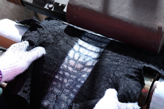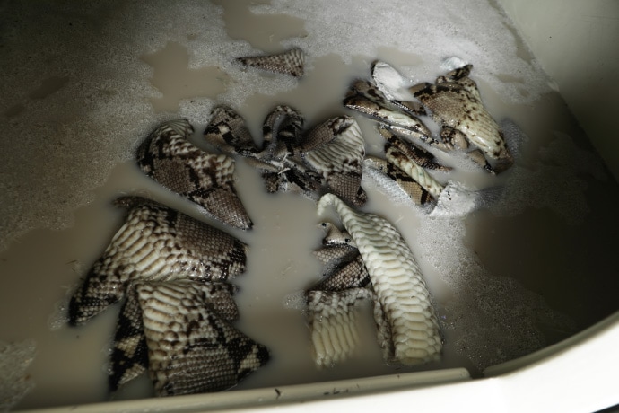 この状態でドラムと呼ばれる機械を回し、ワニ皮で3~5日間、ヘビ革やトカゲ皮で2~3日間回します。