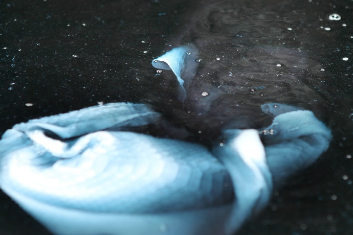 原皮の状態や皮の厚さ、動物の大きさ等、諸条件で水漬の時間を調整します。その都度、水に浸けた皮の状態をチェックし、水から引き上げるタイミングを見計らいます。