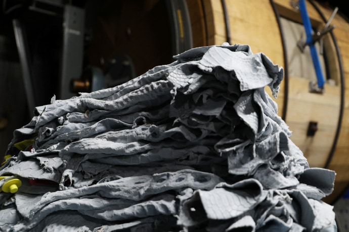 鞣剤を皮に浸透させ、コラーゲン繊維と結合させ、耐久性を加えます。